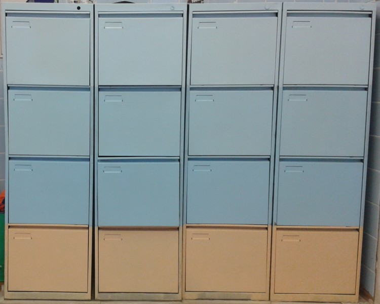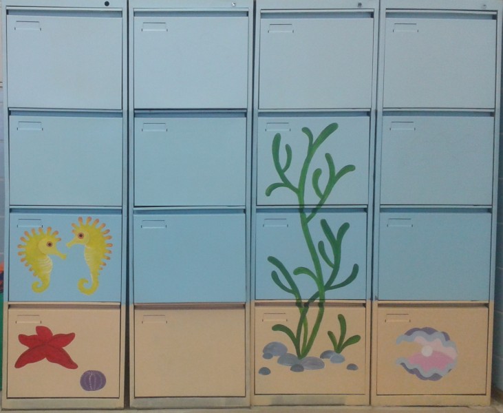 Základem byla opět stará klasická plechová kartotéka z 60. let. Jelikož téměř celá ordinace je vykachličkovaná bledě modře, nějaké podvodní či podmořské téma se nabízelo od prvního okamžiku. Jelikož se jedná o prostor, kde se mají cítit dobře hlavně děti, rozhodla jsem se pro jednoduché tvary, částečnou stylizaci a přesto zachování základních rysů reality.