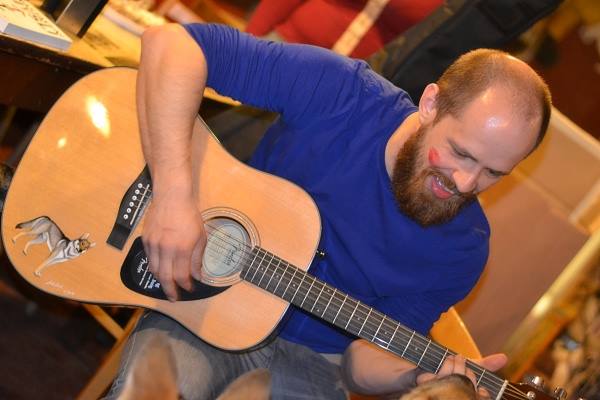 Kytara malovaná na objednávku - dárek k narozeninám. Vzorem byly fotky ("koláž" z fotek) oslavencova psa.